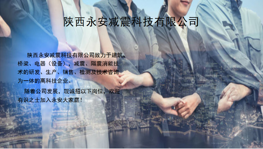 陕西尊龙凯时减震科技有限公司致力于建筑、桥梁、电器(设备),减震、隔震消能技术的研发、生产、销售、检测及技术咨询为一体的高科技企业。 随着公司发展,现诚招以下岗位,欢迎有识之士加入尊龙凯时大家庭!